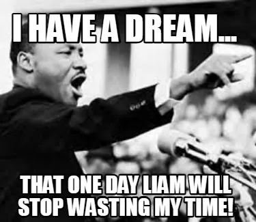Make your own "I have a dream... that one day Liam will stop wasting my time!" meme with MemeCreator's free online meme generator. Add text, stickers, and drawings — then download or share. No watermark, no sign-up required.