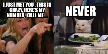 Make your own "I just met you , this is crazy, here's my Number, Call me.... NEVER" meme with MemeCreator's free online meme generator. Add text, stickers, and drawings — then download or share. No watermark, no sign-up required.