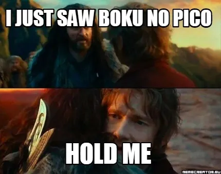 Make your own "I Just saw boku no pico hold me" meme with MemeCreator's free online meme generator. Add text, stickers, and drawings — then download or share. No watermark, no sign-up required.