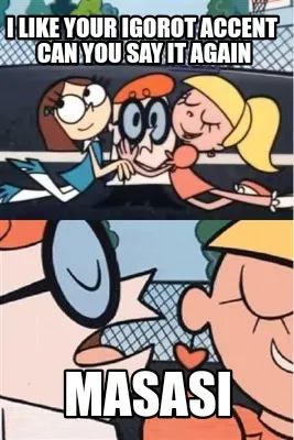 Make your own "I like your igorot accent can you say it again Masasi" meme with MemeCreator's free online meme generator. Add text, stickers, and drawings — then download or share. No watermark, no sign-up required.