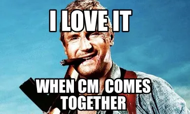 Make your own "I Love It When Cm Comes Together" meme with MemeCreator's free online meme generator. Add text, stickers, and drawings — then download or share. No watermark, no sign-up required.
