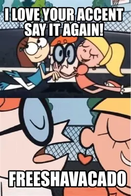 Make your own "I love your accent say it again! freeshavacado" meme with MemeCreator's free online meme generator. Add text, stickers, and drawings — then download or share. No watermark, no sign-up required.