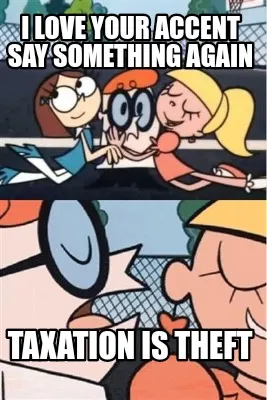 Make your own "I love your accent say something again Taxation is theft" meme with MemeCreator's free online meme generator. Add text, stickers, and drawings — then download or share. No watermark, no sign-up required.