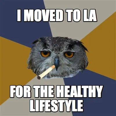 Make your own "I moved to LA for the healthy lifestyle" meme with MemeCreator's free online meme generator. Add text, stickers, and drawings — then download or share. No watermark, no sign-up required.