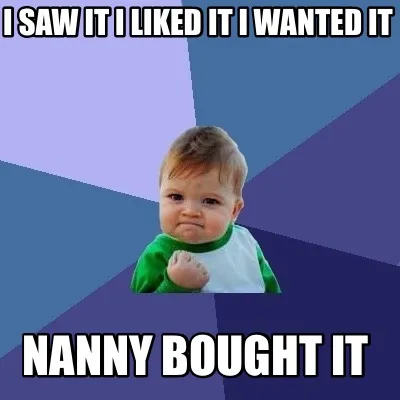 Make your own "I saw it I liked it I wanted it Nanny bought it" meme with MemeCreator's free online meme generator. Add text, stickers, and drawings — then download or share. No watermark, no sign-up required.