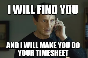 Make your own "Funny I will find you and i will make you do your timesheet" meme with MemeCreator's free online meme generator. Add text, stickers, and drawings — then download or share. No watermark, no sign-up required.