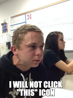 Make your own "Funny I will not click "this" icon" meme with MemeCreator's free online meme generator. Add text, stickers, and drawings — then download or share. No watermark, no sign-up required.