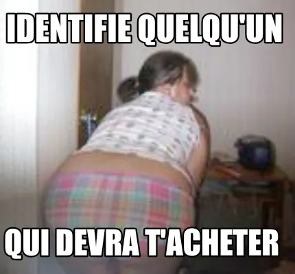 Make your own "Funny Identifie quelqu'un Qui devra t'acheter" meme with MemeCreator's free online meme generator. Add text, stickers, and drawings — then download or share. No watermark, no sign-up required.