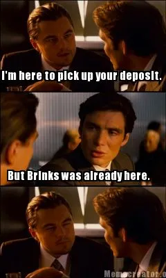 Funny I'm here to pick up your deposit. But Brinks was already here. Meme Template