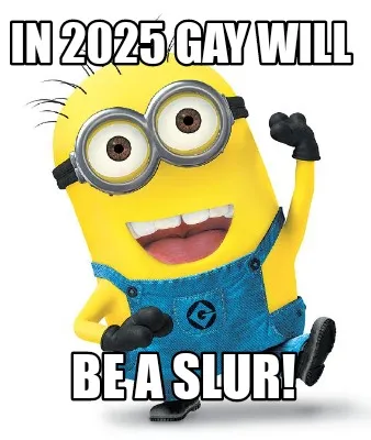 Make your own "Funny in 2025 gay will be a slur!" meme with MemeCreator's free online meme generator. Add text, stickers, and drawings — then download or share. No watermark, no sign-up required.