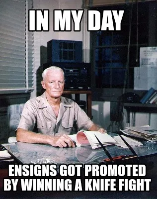 Funny IN MY DAY Ensigns got promoted by winning a knife fight Meme Template