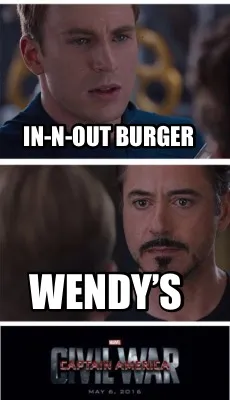 Make your own "IN-N-OUT BURGER Wendy’s" meme with MemeCreator's free online meme generator. Add text, stickers, and drawings — then download or share. No watermark, no sign-up required.