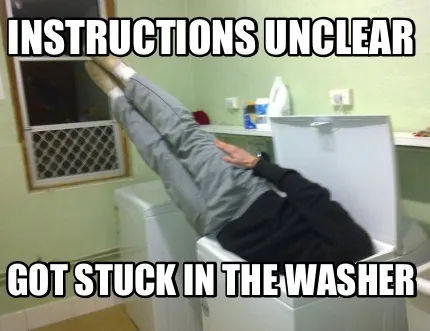 Make your own "Instructions Unclear Got stuck in the washer" meme with MemeCreator's free online meme generator. Add text, stickers, and drawings — then download or share. No watermark, no sign-up required.