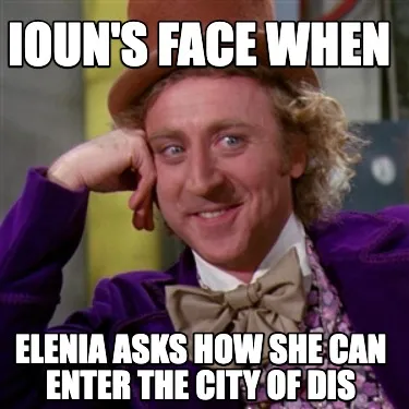 Create Ioun's face when Elenia asks how she can enter the city of dis Meme