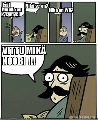 Make your own "Isä! Minulla on kysymys! Mikä se on? Mikä on WH? VITTU MIKÄ NOOBI !!!" meme with MemeCreator's free online meme generator. Add text, stickers, and drawings — then download or share. No watermark, no sign-up required.