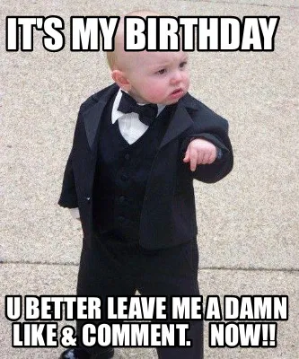 Make your own "Funny IT'S MY BIRTHDAY U BETTER LEAVE ME A DAMN LIKE & COMMENT. NOW!!" meme with MemeCreator's free online meme generator. Add text, stickers, and drawings — then download or share. No watermark, no sign-up required.
