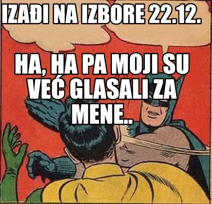 Make your own "Izai Na Izbore 22.12. Ha Ha Pa Moji Su Ve Glasali Za Mene" meme with MemeCreator's free online meme generator. Add text, stickers, and drawings — then download or share. No watermark, no sign-up required.