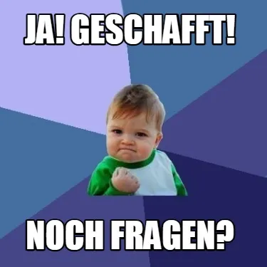 Make your own "Ja! geschafft! Noch Fragen?" meme with MemeCreator's free online meme generator. Add text, stickers, and drawings — then download or share. No watermark, no sign-up required.