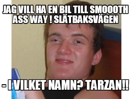 Make your own "Jag Vill Ha En Bil Till Smoooth Ass Way Sltbaksvgen I Vilket Namn Tarzan" meme with MemeCreator's free online meme generator. Add text, stickers, and drawings — then download or share. No watermark, no sign-up required.