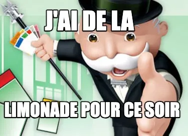 Make your own "J'ai de la limonade pour ce soir" meme with MemeCreator's free online meme generator. Add text, stickers, and drawings — then download or share. No watermark, no sign-up required.