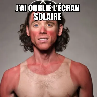 Make your own "J’ai oublié l’écran solaire" meme with MemeCreator's free online meme generator. Add text, stickers, and drawings — then download or share. No watermark, no sign-up required.