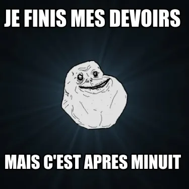 Make your own "Je finis mes devoirs mais c'est apres minuit" meme with MemeCreator's free online meme generator. Add text, stickers, and drawings — then download or share. No watermark, no sign-up required.