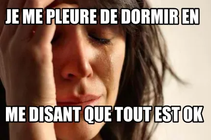 Make your own "Funny je me pleure de dormir en me disant que tout est ok" meme with MemeCreator's free online meme generator. Add text, stickers, and drawings — then download or share. No watermark, no sign-up required.