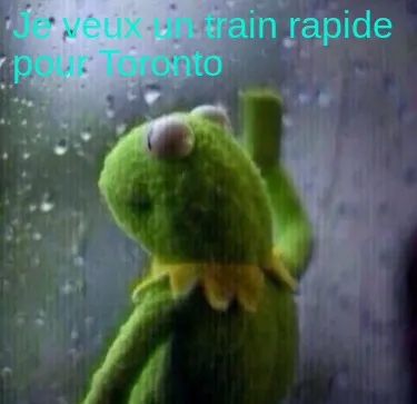 Make your own "Je veux un train rapide pour Toronto" meme with MemeCreator's free online meme generator. Add text, stickers, and drawings — then download or share. No watermark, no sign-up required.