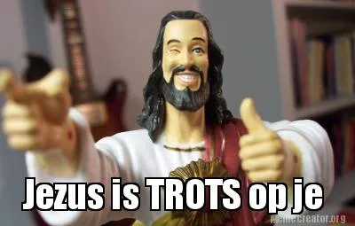 Make your own "Funny Jezus is TROTS op je" meme with MemeCreator's free online meme generator. Add text, stickers, and drawings — then download or share. No watermark, no sign-up required.