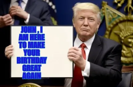 Make your own "Funny John , i am here to make your birthday great again" meme with MemeCreator's free online meme generator. Add text, stickers, and drawings — then download or share. No watermark, no sign-up required.