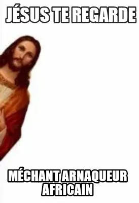 Make your own "Jésus te regarde Méchant arnaqueur africain" meme with MemeCreator's free online meme generator. Add text, stickers, and drawings — then download or share. No watermark, no sign-up required.