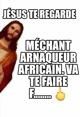 Make your own "Jsus Te Regarde Mchant Arnaqueur Africain. Va Te Faire F........" meme with MemeCreator's free online meme generator. Add text, stickers, and drawings — then download or share. No watermark, no sign-up required.