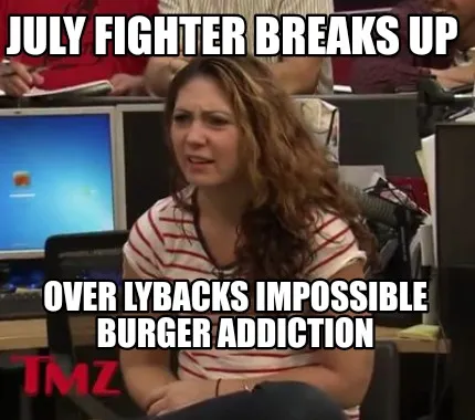 Make your own "Funny July Fighter breaks up Over Lybacks impossible burger addiction" meme with MemeCreator's free online meme generator. Add text, stickers, and drawings — then download or share. No watermark, no sign-up required.