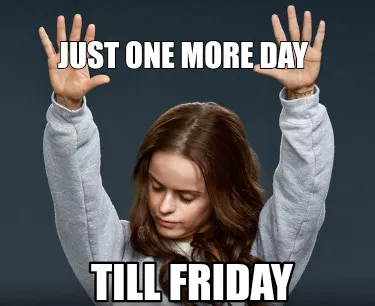 Make your own "Just one more day Till Friday" meme with MemeCreator's free online meme generator. Add text, stickers, and drawings — then download or share. No watermark, no sign-up required.