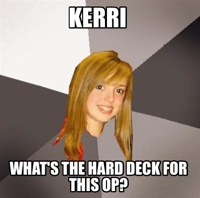 Make your own "Funny Kerri What's the hard deck for this op?" meme with MemeCreator's free online meme generator. Add text, stickers, and drawings — then download or share. No watermark, no sign-up required.