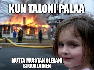 Make your own "Kun taloni palaa Mutta muistan olevani stooalainen" meme with MemeCreator's free online meme generator. Add text, stickers, and drawings — then download or share. No watermark, no sign-up required.