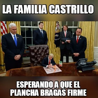 Make your own "LA FAMILIA CASTRILLO ESPERANDO A QUE EL PLANCHA BRAGAS FIRME" meme with MemeCreator's free online meme generator. Add text, stickers, and drawings — then download or share. No watermark, no sign-up required.