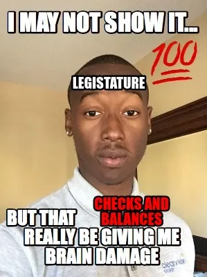 Make your own "Legistature Checks And Balances" meme with MemeCreator's free online meme generator. Add text, stickers, and drawings — then download or share. No watermark, no sign-up required.