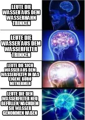 Make your own "Leute die Wasser aus dem Wasserhahn trinken Leute die den Wasserfilter neu befü" meme with MemeCreator's free online meme generator. Add text, stickers, and drawings — then download or share. No watermark, no sign-up required.