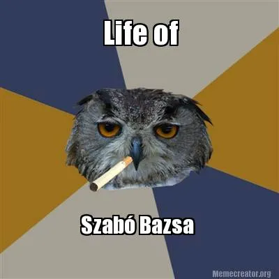 Make your own "Life of Szabó Bazsa" meme with MemeCreator's free online meme generator. Add text, stickers, and drawings — then download or share. No watermark, no sign-up required.
