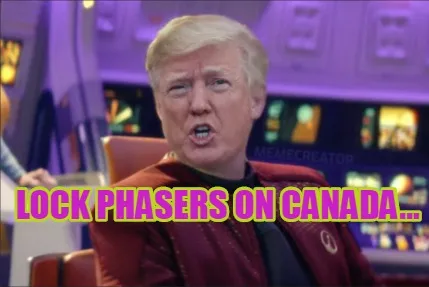 Make your own "LOCK PHASERS ON CANADA..." meme with MemeCreator's free online meme generator. Add text, stickers, and drawings — then download or share. No watermark, no sign-up required.