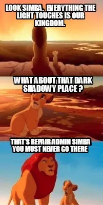 Make your own "Look Simba. everything the light touches is our kingdom. that's repair admin S" meme with MemeCreator's free online meme generator. Add text, stickers, and drawings — then download or share. No watermark, no sign-up required.