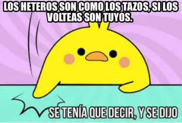 Make your own "Los Heteros son como los tazos, si los volteas son tuyos." meme with MemeCreator's free online meme generator. Add text, stickers, and drawings — then download or share. No watermark, no sign-up required.