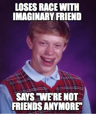 Make your own "Loses Race with imaginary Friend Says "We're not friends anymore"" meme with MemeCreator's free online meme generator. Add text, stickers, and drawings — then download or share. No watermark, no sign-up required.