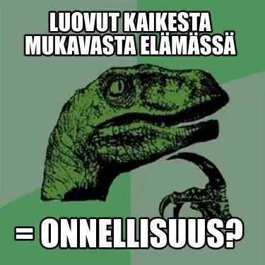 Make your own "Luovut kaikesta mukavasta elämässä = onnellisuus?" meme with MemeCreator's free online meme generator. Add text, stickers, and drawings — then download or share. No watermark, no sign-up required.