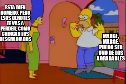 Make your own "MArge, marge, puedo ser uno de los agradables Esta bien Homero, pero esos cerote" meme with MemeCreator's free online meme generator. Add text, stickers, and drawings — then download or share. No watermark, no sign-up required.