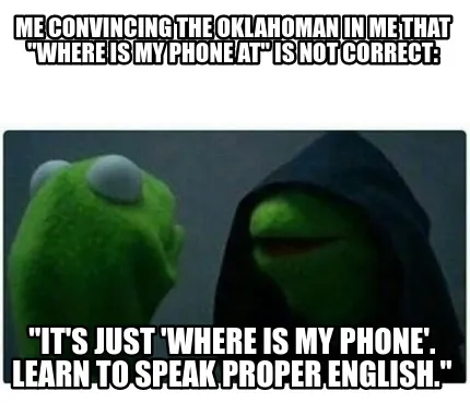 Create Funny Me convincing the oklahoman in me that "Where is my phone at" is not correct: "I Meme
