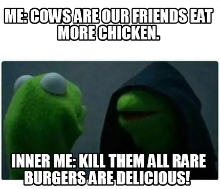 Create Funny Me: Cows are our friends eat more Chicken. Inner me: Kill them all Rare Burgers Meme