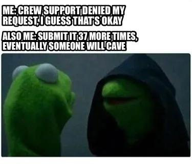Funny Me: crew support denied my request, I guess that’s okay Also me: submit it 37 Meme Template