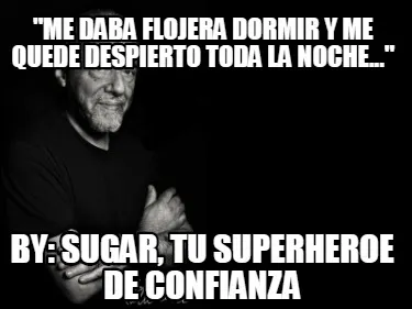 Make your own ""Me daba flojera dormir y me quede despierto toda la noche..." by: sugar, tu sup" meme with MemeCreator's free online meme generator. Add text, stickers, and drawings — then download or share. No watermark, no sign-up required.